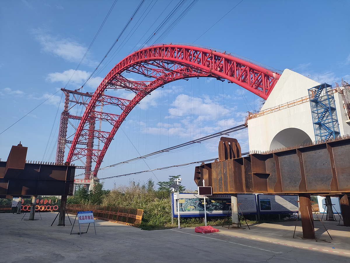 該橋?yàn)橹骺?85米的下承式系桿拱橋,全長1732米,采用2×55t纜索起重機(jī)進(jìn)行安裝,2025年6月16日合龍。