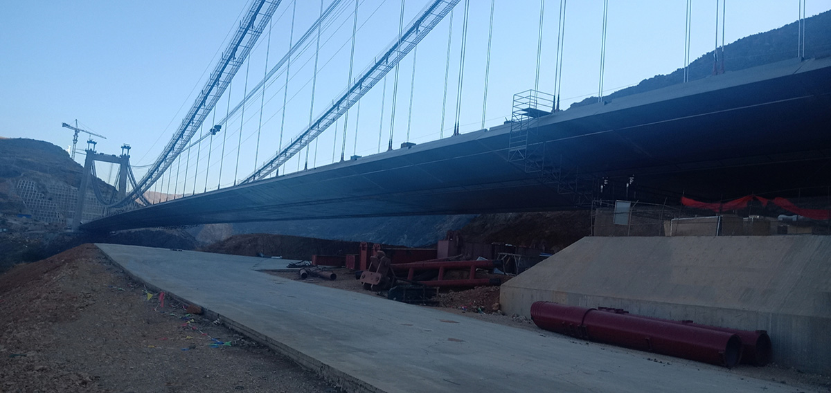 該橋為單跨鋼箱梁懸索橋,主跨636米,采用2×85t纜索起重機安裝,2019年12月31日合龍。